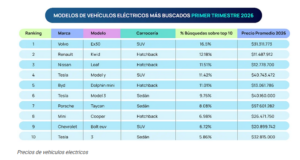 Al analizar ranking y las preferencias por carrocería, los SUV lideran el interés, seguidos por hatchbacks y sedanes. En cuanto a precios, la demanda se concentra principalmente en opciones que fluctúan entre los $11 y $40 millones, aunque también destacan alternativas más accesibles dentro del segmento. Entre los modelos que generan mayor interés se encuentran el Volvo EX30, Renault Kwid E-Tech, Nissan Leaf, Tesla Model Y y BYD Dolphin Mini.