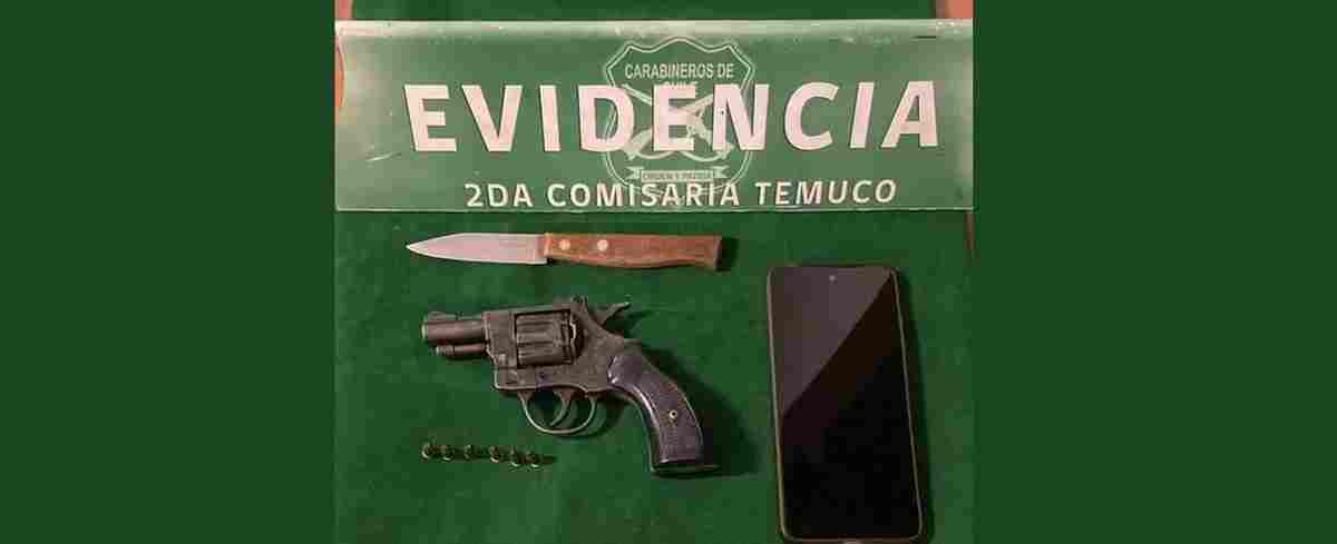 Carabineros de la 2ª Comisaría de Temuco, en el contexto de las estrategias implementadas en coordinación con establecimientos educacionales de la comuna, detuvieron a un adolescente de 15 años incautando un arma de fogueo con seis municiones y un cuchillo, que se lo sacó a la mamá y que lo usa para pelar papas.