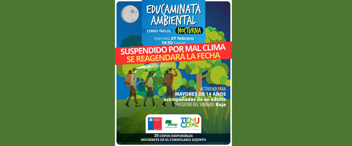 Querida comunidad, debido a las lluvias pronosticadas para este fin de semana, hemos decidido suspender la Educaminata Nocturna programada para este viernes 27/02.