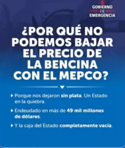 El posteo de la discordia fue difundido por el Ejecutivo la mañana de este martes. En letras blancas y mayúsculas se leía: “¿Por qué no podemos bajar el precio de la bencina con el Mepco? Porque nos dejaron sin plata. Un Estado en la quiebra”.