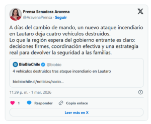 “A días del cambio de mando, un nuevo ataque incendiario en Lautaro deja cuatro vehículos destruidos. Lo que la región espera del gobierno entrante es claro: decisiones firmes, coordinación efectiva y una estrategia real para devolver la seguridad a las familias“, dijo.