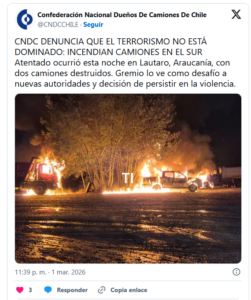 “Atentado ocurrió esta noche en Lautaro, Araucanía, con dos camiones destruidos. Gremio lo ve como desafío a nuevas autoridades y decisión de persistir en la violencia“, expresaron.