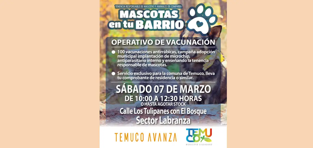 Este Sábado 07 de Marzo, desde las 10:00 a 12:30 horas, te esperamos en la intersección de calle Los Tulipanes con El Bosque para que puedas participar de una nueva jornada del Operativo Veterinario Gratuito, Mascotas en tu Barrio.