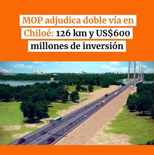 El Ministerio de Obras Públicas confirmó la adjudicación de la concesión para el proyecto de doble vía de la Ruta 5 en Chiloé, entre Chacao y Chonchi, iniciativa que contempla una inversión cercana a los 600 millones de dólares, el mejoramiento de 126 kilómetros y el inicio de obras en 2028, con un plazo estimado de ejecución de cinco años.