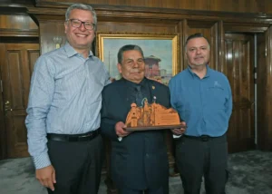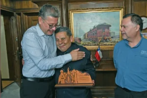 Invitado por el propio alcalde, don Fernando fue convocado hasta el edificio consistorial para recibir de sus manos una medalla y un galvano en reconocimiento a su extensa y destacada trayectoria bomberil, todo esto tras una distendida y fraternal reunión entre ambos, donde no faltaron las risas y las anécdotas, surgidas a partir de las experiencias comunes durante los años en que tanto don Fernando como el alcalde Neira coincidieron en la Bomba Germania.