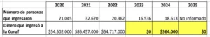 Por otra parte, si se toma como referencia el valor promedio recaudado en 2022, en los periodos de 2023 y 2024, se debió recaudar $44.435.729 y $50.017.067 respectivamente, sin embargo, para 2023 Conaf informa $0 (cero pesos) recibidos y en 2024, sólo 364 mil pesos, reiteramos.
