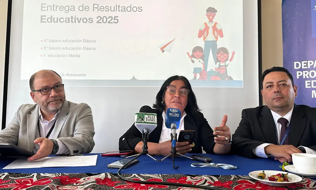La seremi de Educación, Marcela Castro Armijo, junto al vocero Agencia de Calidad de la Educación Macrozona Sur, Cristian Córdova, dieron a conocer hoy los Resultados Educativos Simce 2025 para La Araucanía, correspondientes a las evaluaciones de Matemática y Lectura en los niveles de 4° y 8° básico, y II medio.